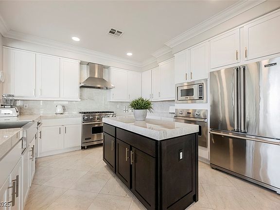 Dramatic Entry Leading Into This Red Rock Country Club Dream Home With Winding Staircase and 2 Story Cathedral Ceilings In Living Room. Separate Sitting Room Off Living Area Would Make A Great Library. Delightful Gourmet Upgraded Kitchen With Viking Appliances, Taj Mahal Quartz Counters, Soft Close Custom Cabinets, Crown Molding, and Marble Floors. Up The Winding Staircase Where The Primary Bedroom Suite Is Separated From The 2 Secondary Bedrooms By A Classy Loft Overlooking The 2 Story Living Room. Bathrooms Are Light And Bright With Calcutta Vagli Marble Counters, Calcutta Gold Floors, And Seamless Shower Enclosures. Extra Features Include Custom Primary Closet, AND All New Windows. Outside Lives Like Paradise With Covered Patio Off The Family Room, Spool (Mini Pool/Spa) With Water Feature And Views Of The Spectacular Golf Course and Lake.