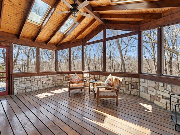 The main floor boasts a chef’s kitchen equipped with custom cabinets, stainless steel appliances, an exhaust system, and ample stone countertop space for culinary endeavors. The spacious and open living room features a boxed ceiling, built-in seating, and a fireplace. Enjoy panoramic views from the vaulted three-season screened-in porch, which includes a natural stone base and skylights. Other main level highlights include both formal and informal dining options, a bedroom, bathroom, and laundry facilities.