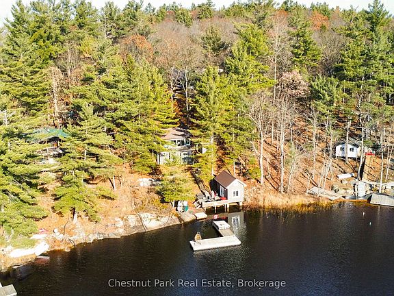 Discover the epitome of refined lakeside living with this exceptional turn-key cottage on the tranquil shores of Brandy Lake, just moments from the boutique charm and fine dining of Port Carling. Designed with effortless luxury in mind, this inviting retreat blends timeless Muskoka character with modern comfort.The main cottage features three beautifully appointed bedrooms and two elegant bathrooms, offering an intimate yet spacious haven for family and guests. Sunlight pours through expansive windows, framing sweeping lake vistas and filling the interiors with a warm, serene glow. Every space is crafted to enhance connection to the water-from morning coffee enjoyed on the deck to cozy evenings as the sun sets in a blaze of colour across the shoreline.Perfectly positioned for hosting, the property also boasts a delightful, fully equipped guest cottage complete with a private bedroom, stylish 3-piece bath, and kitchenette-an ideal sanctuary for visitors seeking their own luxurious escape. At the water's edge, a rare dry boathouse provides unparalleled convenience and lakeside dining, while the spacious dock invites long afternoons in the sun, sunset cocktails, and unforgettable moments with loved ones. Mature trees, natural granite, and thoughtfully designed outdoor spaces complete this picturesque setting, offering endless opportunities for relaxation and recreation. Whether you're dreaming of a year-round residence or an elegant seasonal getaway, this distinguished Brandy Lake property offers an extraordinary opportunity to experience Muskoka waterfront living at its finest. Indulge in serenity, beauty, and luxury-your lakeside paradise awaits.