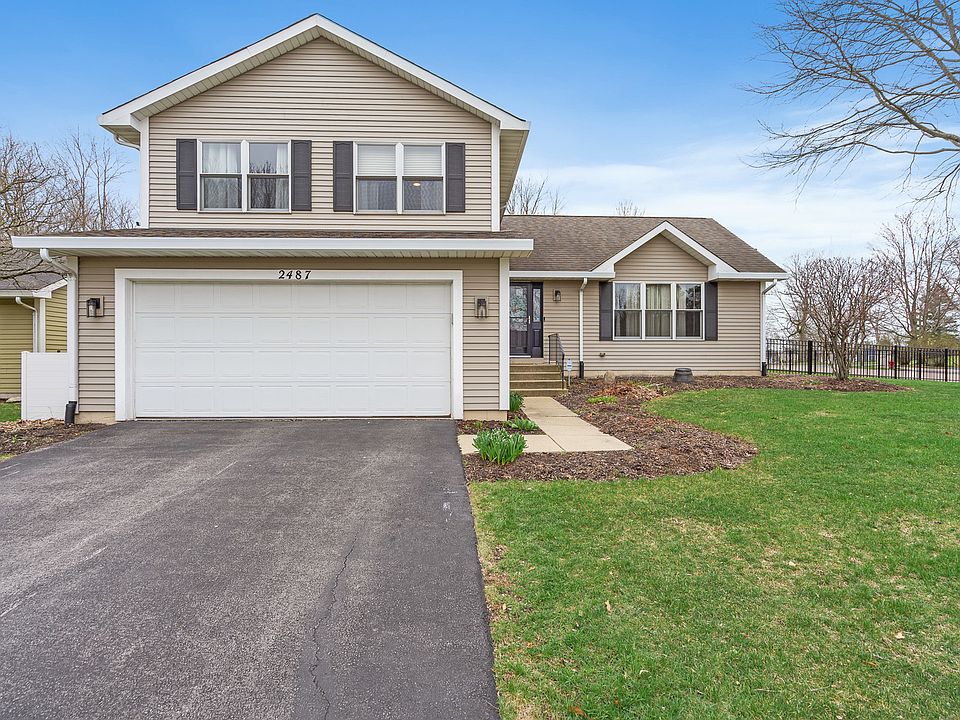 Nestled on a prime corner lot on a quiet cul-de-sac in the highly sought-after District 204, this beautifully updated tri-level home offers a perfect blend of modern updates and comfortable living. Step inside to a vaulted living room with recessed lighting, creating a bright and airy atmosphere. The updated kitchen boasts 42-inch custom cherry cabinets with upper and lower cabinet lighting and crown molding, stainless steel appliances (including a brand-new stove), a pantry, and a dining area with a newer Pella sliding glass door leading to the spacious deck that's shaded by a convenient, electric awning. The fenced yard, bordered by mature trees, offers both privacy and charm, complete with a shed for extra storage. The lower level features a spacious family room, a beautifully remodeled half bath, and a laundry area. A crawl space provides even more storage. Upstairs, the vaulted master bedroom includes double closets and a private, nicely updated ensuite bath with an oversized shower. A second updated bathroom serves the additional bedrooms. The heated two-car garage with an epoxy floor offers extra storage and even a TV setup-ideal for a man cave! Additional upgrades include Pella windows with built-in blinds throughout for style and efficiency, newer roof and siding. This home is move-in ready and perfectly located-don't miss out on this incredible opportunity!