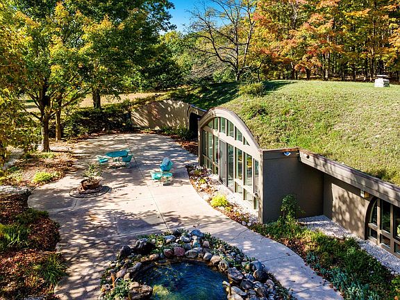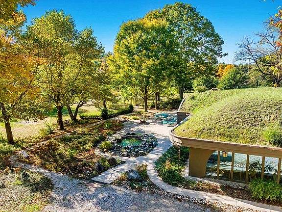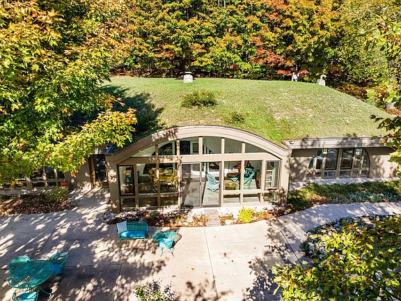 Situated on nearly 50 acres on scenic Trumbull Road, this iconic earth berm home has been tastefully updated to retain the unique character and charm of the original architecture. The three-bedroom, two-bath home features all main floor living with arched doorways and large windows that provide an abundance of light throughout the home. A beautiful double-sided stone fireplace anchors the living and dining areas. Just off the main living room is a tiled sunroom with floor-to-ceiling windows overlooking the garden and concrete fishpond. Outside, the four-car detached garage includes one stall that is tall enough to house a boat or motor home. The stunning property contains rolling hills with a mixture of pine and hardwoods, and a two-acre chestnut orchard. Two miles from Glen Lake Schools, Palmer Woods, Big Glen Lake, and Sleeping Bear Dunes National Lakeshore, this home is perfectly situated with hiking trails, beaches, and amenities just minutes away.