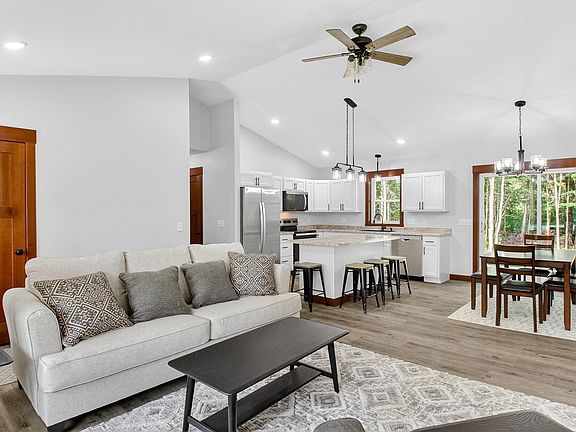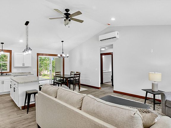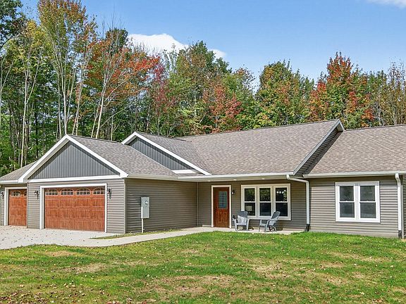 Nestled just outside of Cadott, this beautifully crafted zero-entry ranch home combines comfort, style, and convenience. The open-concept layout features vaulted ceilings in the living room, dining area, and kitchen—creating a bright, airy atmosphere perfect for everyday living and entertaining. A spacious kitchen island adds to the home's hosting appeal, while all major kitchen appliances are included for your convenience. The master suite offers a touch of luxury with a tray-vault ceiling, dual sinks, walk-in shower, and walk-in closet. Wide 36-inch doorways throughout provide easy accessibility. Step outside and enjoy peaceful views from the covered front or back porch, surrounded by mature trees and a private backyard. Oversized concrete driveway and an attached 24x34 heated garage is fully finished, offering plenty of space for storage or projects. Located just off a major highway, this home makes commuting a breeze while still giving you a quiet, private retreat to come home to.