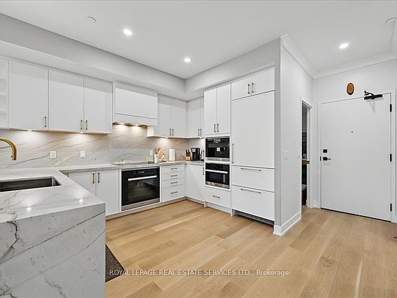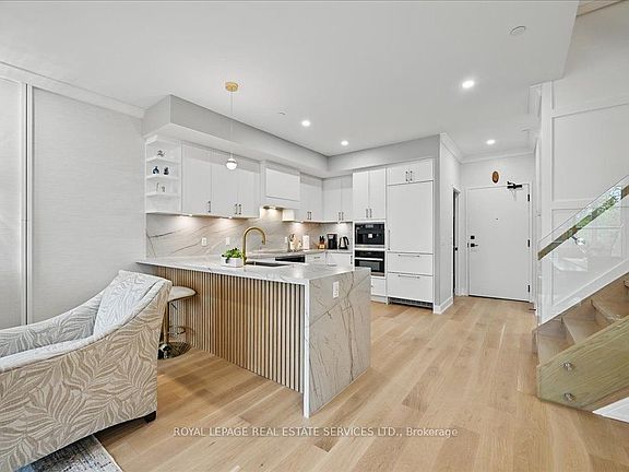OVER $100K IN CUSTOM UPGRADES! RAVINE-VIEW EXECUTIVE TOWNHOME! TWO SIDE-BY-SIDE PARKING SPACES! Discover the perfect blend of luxury and tranquility in this impeccably designed two bedroom plus spacious den townhome, where every detail reflects sophistication and comfort. Set against a serene ravine backdrop, this residence offers inspiring views that create a rare sense of calm and connection to nature within the city. Rich oak hardwood floors flow seamlessly throughout, enhanced by designer wallpaper that adds texture and visual interest. The chef's kitchen impresses with premium Miele appliances, a generous pantry, and an elegant balance of form and function. Over $100K in custom upgrades elevates the home's character, including a bespoke wall unit, sleek central fireplace, built-in dining cabinetry, refined crown moldings, and a striking staircase with glass panels and artistic detailing. The versatile den with its own ensuite bathroom adapts easily to your lifestyle - ideal as a guest suite, home office, or third bedroom. Upstairs, spa-inspired bathrooms showcase upgraded backsplashes, statement mirrors, and contemporary finishes. Designer chandeliers and sconce lighting create a warm, inviting ambiance throughout. Thoughtfully curated and beautifully finished, this residence is more than a home - it's a private retreat of style, comfort, and inspired design.