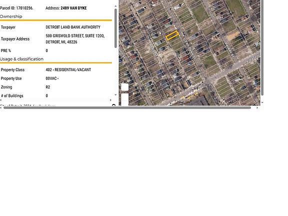 An awesome opportunity to develop land right in the Historic Island View/Greater Villages neighborhoods. This lot is sold in a bundle of 3 vacant lots with 2483 and 2495 Van Dyke. Totaling 9,817 sqft. Not sold separately. Zoned R2. Within walking distance to West Village shops, restaurants, Biergarten, and Belle Isle. Please note that the DLBA is entitled to a tax capture for the 5 tax years subsequent to transferring ownership of the property. The tax capture may be incompatible with tax abatement that are otherwise available to the selected purchaser. DLBA will review requests to waive its tax capture rights and may require a payment in lieu of taxes to approve such requests. The payment will be determined upon reviewing the development proforma and effect of any tax abatement on the purchase and development financing. Please see attached documents for DLBA requirements and offer submission information.