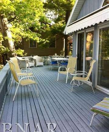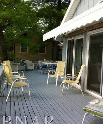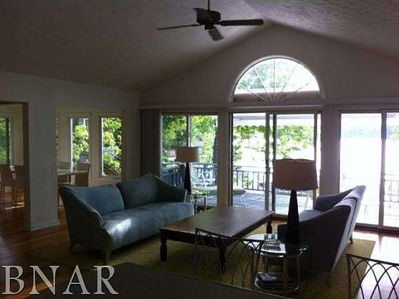 Direct lakefront with expansive views from living, dining and large master. Extensive lakefront deck with 20+ ft electric awning. Walk-out lower level. Oversized 2 car garage; room for workshop. Dining room can be converted back to 3rd bedroom; lower level bedroom possible. Leasehold land at lake. 2 water heaters, a/c and furnaces. 2nd bedroom on slab. 2 wood-burning fireplaces. Large laundry/craft room.