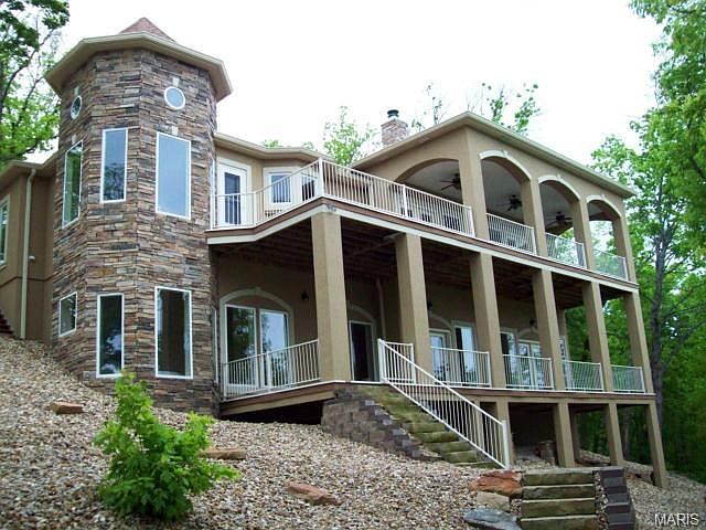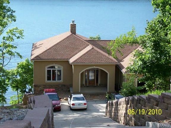 **EXCLUDE THE REFRIGERATOR & WINE COOLER & Washer and Dryer. This is a custom lakefront home on the Lake of the Ozarks with 200 ft of lake front, located at the 56 MM. Custom Rock sidewalk. Rock yard for easy maintenance. Home has an ECOPOD septic system and a private well. Two decks view the lake. Decks are partially covered for your protection. Large dining room. There are two master bedroom suites with private baths. One master has a jetted tub. There are two additional bedrooms with a shared bath and an extra half. There are two great rooms, each with a fireplace for the cold months. The kitchen is a gourmet chefs delight or entertainers dream. Kitchen has 6 burner gas cooktop and a wall oven and microwave. Granite countertops . Prep sink and counter and large breakfast bar. Two car garage. Laundry rm.. Approx. 2700 sq ft finished and approx 150 sq ft furnance and storage area. 38X36 Covered dock with a 6000# hoist and storage unit and stainless table,2 boat slips