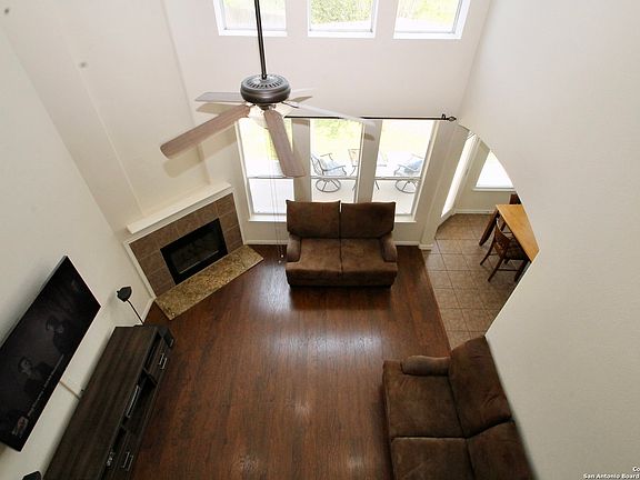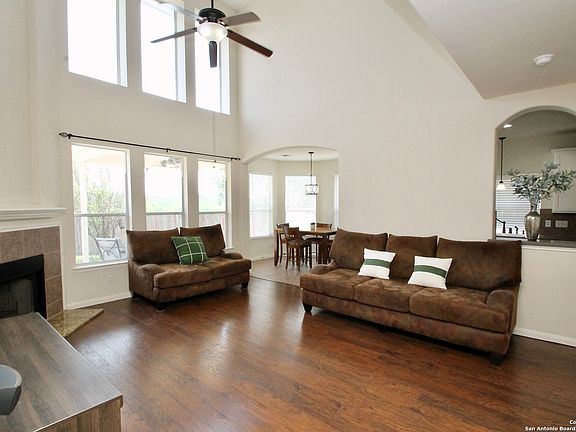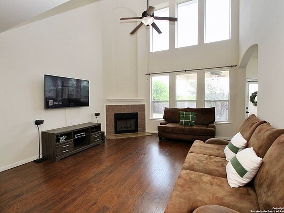 This move in ready home is found on a culdesac lot that backs to a greenbelt. Soaring ceilings allow for natural sunlight to permeate throughout. Functional floorplan allows for a spacious living area, eat in kitchen and separate dining room. This home also offers hardwood flooring, crown molding and Wainscoting. All secondary bedrooms located upstairs. Covered patio with expanded slab over the accommodating backyard.