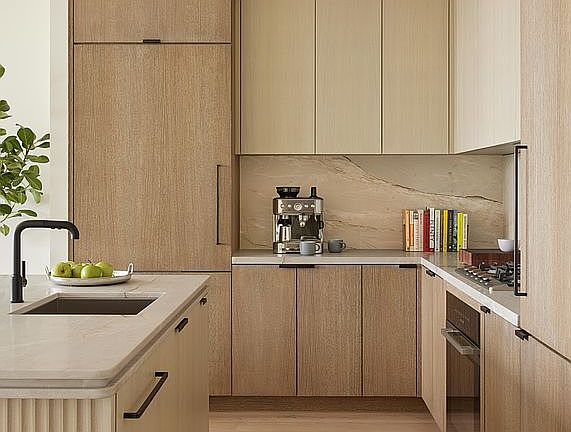 The open kitchen has a spacious island clad with custom millwork, cerused oak cabinetry and bespoke Mont Blanc quartzite countertops, providing an inviting setting for everyday living. Mindful lighting adds warmth and a full suite of Miele appliances ensures premium-caliber performance.
