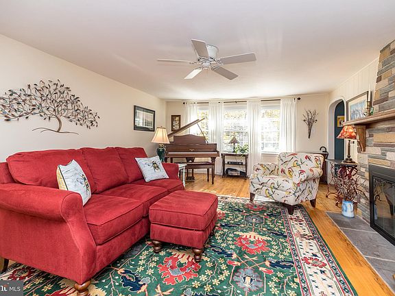 Welcome to this adorable and charming ranch home nestled on a private acre surrounded by thoughtful landscaping—including a mature asparagus garden! You’ll fall in love before you even step inside. The inviting front porch and cheerful yellow door set the tone for what’s to come. Inside, warm hardwood floors, arched doorways, and custom built-ins create a cozy, timeless feel. The spacious living room shines with a floor-to-ceiling stone wood-burning fireplace and handcrafted mahogany mantle, plus a large bay window, custom built-ins and sliding glass door that flood the space with natural light and open to the Trex deck. Through a charming archway awaits the show-stopping kitchen—the true heart of the home—featuring vaulted ceilings with exposed beams, curly worm bird’s eye maple floors kilned dried and milled by New Britain’s own Ambrose Randa, authentic shiplap ceiling, granite counters and island, double porcelain farm sink, and premium appliances, including double ovens and a 5-burner gas stove (propane/leased), there is also under cabinet lighting, wall microwave, wainscotting backsplash, pantry, french door to deck. . Adjacent, find a laundry room with antique laundry tub with drainboard that has been sandblasted and enamel coated, and updated powder room, plus access to a peaceful flagstone patio. Three generous bedrooms with ceiling fans and double closets, 1 bedroom boasts a wall to wall built-in desk to make life even easier living here. An updated full bath, complete the main level of the home. Some of the other highlights include a large unfinished basement that has been waterproofed with yet another wood burning fireplace, newer oil tank, bilco doors, washer and dryer hook-up ready if desired, 1 1/2 car garage with openers, also pull down stairs to attic, cedar closet in hallway, newer tilt-n windows locally made by George Dailey of Hatboro, shed in backyard, platform in back right of the property is for a hot tub, connection is set-up. Lovingly maintained and truly one-of-a-kind—come see it to believe it!