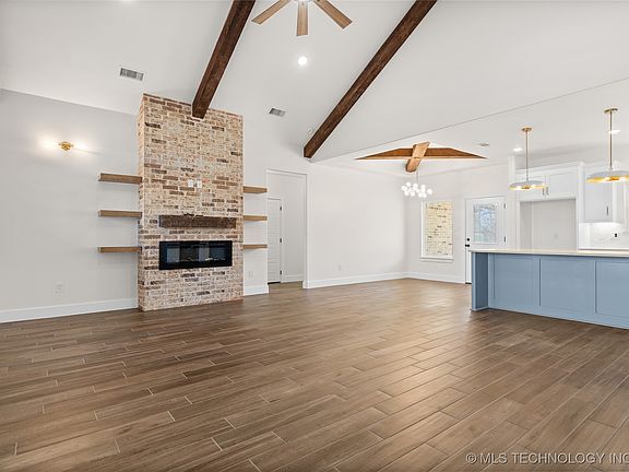 Striking wood beam accentsFloating shelvesWalk-in closetOpen-concept layoutElectric rangePrivate primary suiteSleek stainless appliances