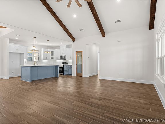 Exquisite new construction home showcasing a custom design with 4 bedrooms and 2 beautifully appointed bathrooms. This stunning residence features an open-concept layout centered around a chef’s kitchen with an oversized island, quartz countertops, farmhouse sink, custom tile backsplash, and sleek stainless appliances including an electric range, microwave, and dishwasher.