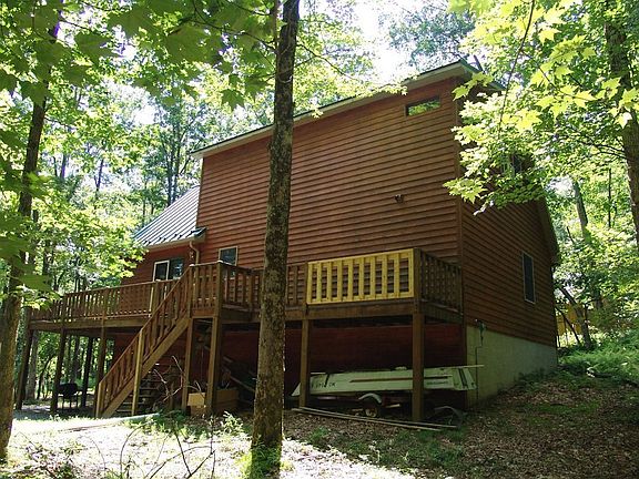 T77 AL, Chalet, 6 room, 2 bedroom, 2 bath. Great room with lots of windows, stone fireplace, cathedral ceiling with tongue & groove pine. Downstairs bedroom with a walk through closet to bath, alcove off bedroom. Upstairs bedroom & bath feature walk-in closet, tile counter tops & whirlpool bath. Kitchen with tile countertops & backsplash, very large tile bar & granite sink. Open staircase with loft overlooking great room, close to lake & boathouse, natural wooded lot. Large wrap around deck. Full basement with buck stove in family room, laundry room & plumbed for bathroom. Propane forced air heat $139,900