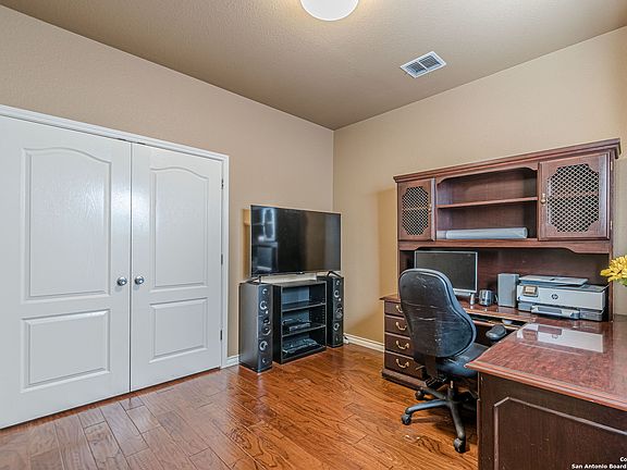 Hill Country Living in Lakewood Estates! Welcome to this stunning 4-bedroom, 3-bathroom home nestled on 2.47 acres in the desirable Lakewood Estates community of Lakehills, Texas. Inside, you'll find an open and airy layout featuring soaring 14-foot ceilings in the living room with a wood-burning fireplace, perfect for cozy evenings with the family. The living room flows seamlessly into the stylish kitchen equipped with LG smart appliances, walk-in pantry, granite countertops, an island, and plenty of storage space. Features of the primary bedroom include a spacious walk-in closet, garden tub with separate shower, separate vanities, and it's own direct access to the patio. The home also includes a dedicated office, ideal for working remotely or managing household projects, and a 2025 water softener for added comfort and efficiency. The pool table is also negotiable with the sale, making this home an entertainer's dream. The attached guest suite offers ultimate versatility with its own kitchen, private bathroom, and living area that's ideal for extended family or guests. Step outside to the newly built, expansive back patio, where you can take in breathtaking Hill Country views and unforgettable sunsets. Its generous size offers endless possibilities for outdoor dining, lounging, or hosting under the Texas sky, all surrounded by the beauty and shade of mature Oak trees. The property features a metal shed with a 50-amp RV hookup that has ample space for storage and can fit up to three full-size vehicles. Additionally, it features another shed with electricity, a pad already in place for an above ground pool, fenced in play set for the kids, a dog run, and seasonal creek. Here in Lakewood Estates, you'll have access to exceptional neighborhood gated amenities to include, a sparkling community pool, playground, volleyball and basketball courts, lots of nature walking and a private boat ramp to Lake Medina - PERFECT for weekends on the water or sunset picnics! This home truly captures the best of Texas Hill Country living!