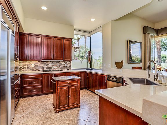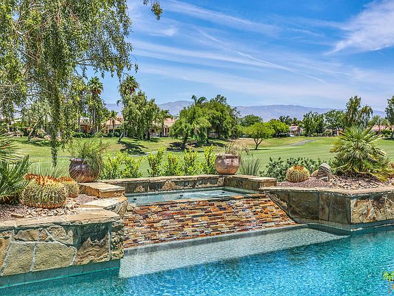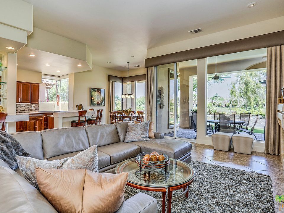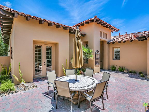 Stunning,Furnished, spectacular Legacy Estate home! As soon as you enter the double doors into the courtyard you are transported to an Italian Villa with a sleek contemporary flair. The courtyard patio is all bricked with a stacked stone fireplace. Perfect setting for outdoor living and entertainment. Seller recently replaced the counters with Quartz. New Blinds and Custom Window Coverings. 20 inch tiles. Stainless steel appliances,custom baseboards,wet bar, fireplace in great room. Walls of glass to take in the gorgeous pebble tech salt water pool with waterfall. All of this overlooking the Golf course. Main house has 3 baths, 2 bedrooms, den/office, walk in closet. The separate and freestanding Casita make up the 3rd bedroom and bath. Leased Solar System. HOA includes a social and fitness membership. 2 car garage with additional space for golf cart. Located in Rancho Mirage, this elegant home will satisfy your fussiest buyers. Come take a look. You won't be disappointed.