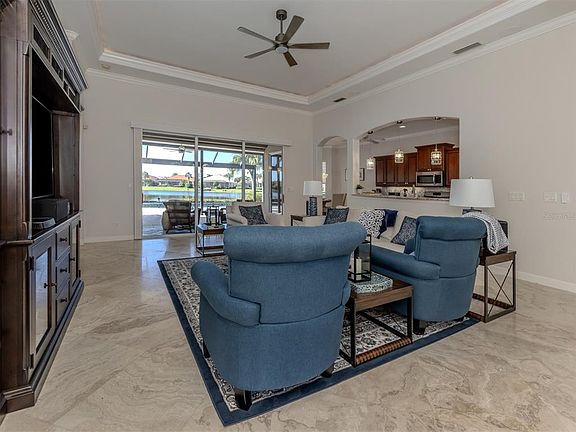 Luxury awaits you at the Venetian Golf and River Club as you experience this fully upgraded Correggio model with many improvements including new lighting, ceiling fans, beveled glass front door, all new custom window treatments, newer landscaping and more! This home shows like a model, and is situated on a premium, oversized lot with a highly desired southern exposure. It is rare to find such a pristine lakefront property with a modern, renovated and updated 3 bedroom, 2 bath, plus den/office with saltwater pool and spa home. The heated saltwater pool and hot tub face gorgeous sunset views that are perfect for relaxing and immersing with nature. Watch the amazing birds, fish from your backyard, lounge by the pool or host friends and family on the oversized travertine lanai boasting premium water views. Travertine tiles throughout the main living areas. High ceilings with crown molding, custom lighted tray ceilings and arched entries fill the living areas with a sense of warmth. The oversized kitchen boasts tons of hardwood cabinets, granite countertops, and stainless appliances. The great room plan offers a formal dining space with curved arch alcove and custom lighted tray ceiling and a separate kitchen dining area with awesome views of the pool, spa, wildlife and lake. Primary suite features double bowl sinks, separate soaker tub for maximum relaxation, step in shower and multiple walk-in closets. The exterior offers a paver driveway, large covered lanai and large open travertine paved patio with panoramic screen opening up to maximize lake views. Enjoy resort living at Venetian Golf and River Club, which offers miles of walking sidewalks, community with nature and bird watching, boardwalk trail with Myakka river views, resort style heated pool, spa, and lap pool. Enjoy the pool side Tiki Bar. Other amenities include Fine dining at our 200 seat restaurant, book exchange library, fitness center, exercise classes, tennis courts, pickleball courts, and more. There are organized tennis and pickleball competitions and an onsite pro and shop. For golfers, there is a private membership, active 18 hole championship golf course with one of the area's finest golf clubs. Close to everything, easy access to I-75, area beaches ,plus downtown Venice withs boutique shopping and state of the art medical facilities. The Venice River Park offers a Kayak launch. Don't miss out on this rare opportunity! Come live your best life in this amazing low maintenance lakefront residence