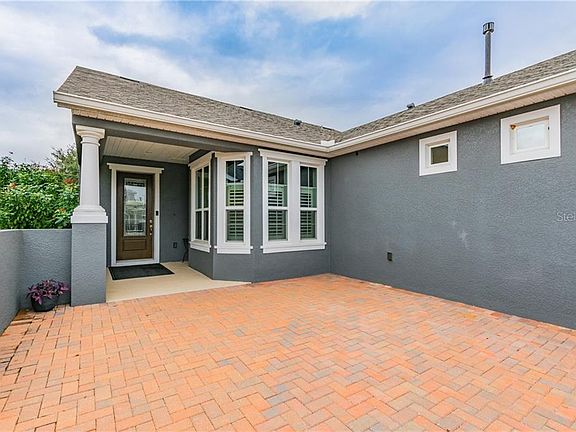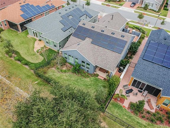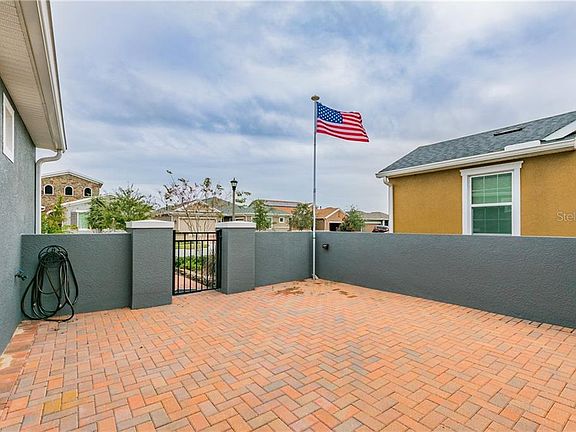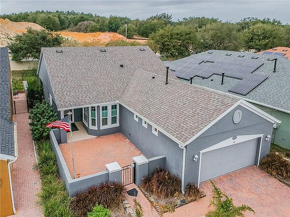 Welcome home to the Good Life in the Premier 55+ active lifestyle community of Trilogy of Orlando... this community boasts the 57,000 square foot Magnolia club house with a top of the line restaurant and bar... fitness center... motion studio... men's and women's locker rooms with jacuzzi hot tubs... card rooms... artisan studio... billiard tables... virtual golf center... large indoor and outdoor pools... pickleball courts... tennis courts... and best of all these centers all have clubs and organized activities. This home has a private front area courtyard and has one of the few fenced backyards, so bring your dog... it's solar system is first rate and wholly owned, not leased... plantation shutters for privacy, but still let the light in... raised ceilings with 8' interior and exterior doors... gas range, hot water and dryer hookups... ceramic tile throughout, a true Florida necessity... silestone counter tops with granite sink and a glass and metal backsplash... oversize master bedroom and bath and walk-in closet... 2nd bedroom was oversized as well... good size den/study area... extra depth added to garage, has room for a work bench or a golf cart as well as large overhead storage shelf already installed...