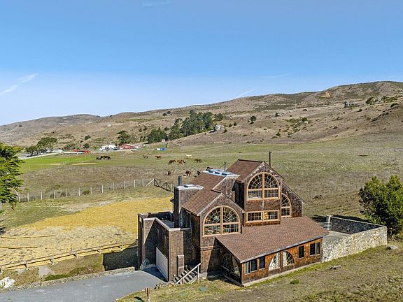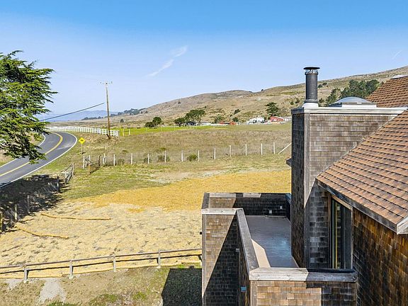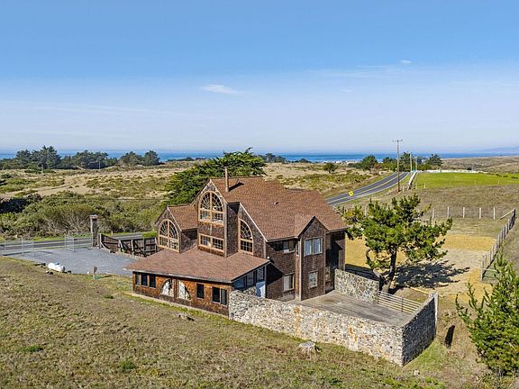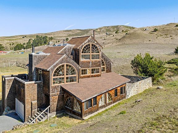 This utterly unique custom home stands as a familiar landmark aside an undulating ribbon of the famed Pacific Coast Highway. Savor spectacular vistas of the coastal hills, Pacific Ocean, and the rugged elevations north of the Russian River. The upper level is accessed by an open staircase constructed of raised-grain fir and custom metalwork. The living areas are open and airy with panoramic views, warmed by a wood burning fireplace and passive solar heat from the south-facing Palladian windows. Tucked away is the primary bedroom with bath en suite and walk-in closet. A wrap around observation deck is shared by the living area with primary suite. Ascend even higher to a loft with built-in daybed and access to the rooftop balcony that affords impressive bird's eye views. The reverse floor plan accommodates two comfortable guest bedrooms on the lower entry level accompanied by a spacious guest bath. Here you'll also find a bright and spacious laundry room with work station, as well as access to a two-car garage with workbench and storage room. There's plenty of parking in the gated driveway for hosting guests. Enjoy close proximity to all Bodega Bay amenities, the Community Center with its seasonal farmers market, and the Sonoma Coast Parks including nearby Coastal Prairie Trail.