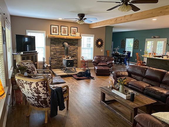 All renovations within the last 5 years. Single-family home. Recently added-on garage, dining area, pantry, laundry room and finished loft over garage. Freshly poured concrete driveway and new front porch. Repainted everything, refinished hardwood floors and carpet upstairs. 6 acres with 2/2 acre fenced pastures, run under shelter, POND, chicken coop, and shed. Beautiful cabin-style home with 4 huge bedrooms with the master on the main. Large master bath with double-head shower and garden tub. Beautiful chef kitchen with new quartz counter tops, 2 sinks and back splash. Large, open family room with wood burning stove, finished basement, covered front and rear porches. Rear porch screened plus lower deck overlooking the pond. Finished bonus room above 2 car garage. Beautiful piece of private property that sits off the road,