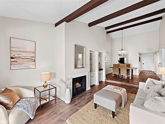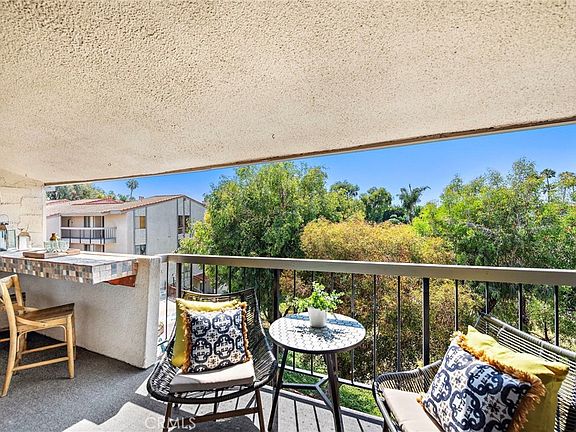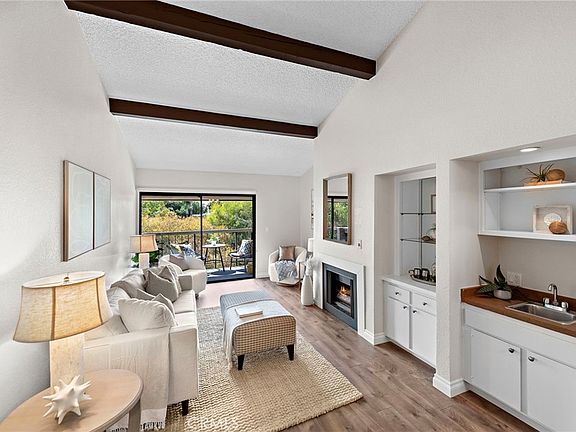 Located in Southwest San Clemente’s coveted Horizons community, this single-level condo presents a rare opportunity to own a property steps away from Calafia and Riviera Beach. Offering a seamless open-concept floor plan, the home’s 1,118 square feet are comprised of generously sized living spaces, two bedrooms, and two bathrooms. The heart of the home is found in the main living areas that showcase impeccable beamed ceilings, built-in accents, wood floors, gas fireplace, and spacious balcony with bar seating. Just off the living areas, the kitchen offers excellent cabinetry space and second dining area ideal for a breakfast nook. Continuing to the living quarters, a double door entry welcomes you into the primary bedroom thoughtfully constructed with a spacious footprint and vaulted ceiling to emphasize the home’s natural light. An oversized bathroom rounds off the primary, complete with dual vanities, ample storage space, and large dressing area. Finishing off the home is a secondary bedroom and bathroom with full-sized laundry hookups and linen storage. Comprised of only 33 units, Horizons is an exclusive community boasting a private and serene atmosphere that is hard to find in beach cities. The unit is assigned two parking spaces, and there is also an abundance of free street parking. Uncommon among most homeowners associations, monthly dues covers gas, hot water heaters, fire insurance, trash, water, spa, and traditional cedar sauna - offering a great value to residents.