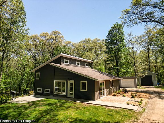 Beautifully updated 4 bed, 2 full bath home on over 5 private acres! Enjoy modern living with new roof, siding, windows, kitchen, bathrooms, paint, and flooring throughout. The open-concept layout is perfect for entertaining, offering a bright and welcoming feel. A large pole barn provides ample storage or workshop space. Just a short walk to Crystal Lake public access—ideal for nature lovers and outdoor fun. Peaceful setting with stylish upgrades—move-in ready!
