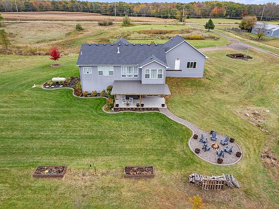 Step inside to an open-concept main level filled with natural light, wide-plank LVP, and a dream kitchen featuring a massive center island, quartz counter tops, double ovens, custom cabinetry, warm wood-accented range hood and a spacious walk in pantry. The dining room and living room are filled with expansive bright windows with a walk out just ready for your future deck. The luxurious primary suite is a true retreat with a spa-inspired bath showcasing dual vanities, granite counters, a tile walk-in shower, and a deep soaking tub framed by a picture-perfect window. Additional main-level highlights include a 2nd bedroom with walk in closet and ¾ bath with all tile shower with bench. A spacious mudroom and main floor laundry complete the upper level for all main floor living with extra wide door frames. The lower level has two completed bedrooms with walk in closets and a ¾ bath. The family room and media room just need carpet and trim which can be finished and included in the purchase. The lower level walks out for you to enjoy peaceful outdoor living with a covered patio, beautifully curved walkways, and a stunning fire pit area designed for gathering under the stars. Additional features include, an attached 3 car garage, RV electrical, gutters and stunning landscaping with a plethora of perennials and concrete curbing. With nearly 10 acres of privacy, a like-new home, and high-end detail inside and out, this exceptional property offers the rare blend of modern comfort and country tranquility perfect for your hobby farm. A must-see for anyone seeking space, beauty, and a home that has been meticulously loved.