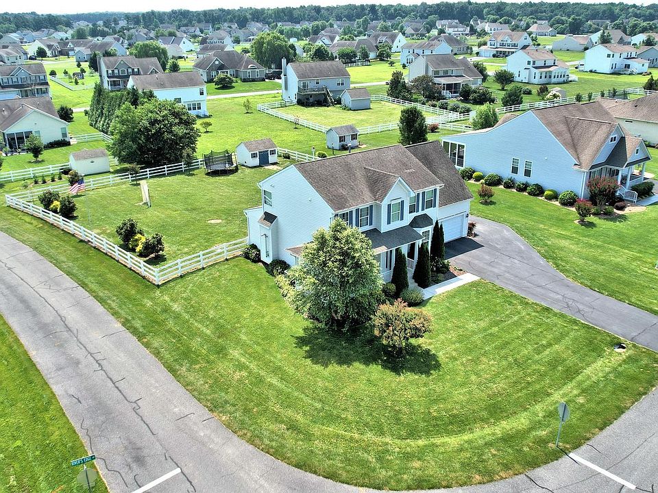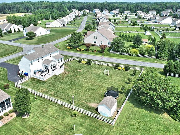 This coastal-styled home is located in the popular community of Stonewater Creek less than 13 miles from both Lewes and Rehoboth beaches. This well-established community offers large lots, central sewer/water, wide streets, and is close to all amenities. The community offers a clubhouse, outdoor pool, fitness, tennis, and new playground amenities while being close to shopping, restaurants, a public golf course, and the Indian River Bay for boating and fishing! The wrap-around porch welcomes you to this well-cared-for home and is a wonderful addition that offers a seating area for morning coffee or an afternoon break. This 2-story home has a traditional layout that is ideal for year-round comfort as well as a great vacation spot allowing separate areas to relax. When you enter the foyer there is an office/flex room with ample natural light, a formal dining room off the kitchen, and a comfortable and spacious living room. The living room has a coastal style with a white, planked feature wall, pellet stove, a wall-hung television (included in the sale), and is wired for surround sound. You will find hardwood floors leading to the open and bright kitchen with an island, stainless steel appliances, and a sunroom addition off the rear of the home with a vaulted ceiling allowing all the natural sunlight to fill the space. From here you can access the recently added composite deck that allows you to spend time having fun and entertaining in the backyard. The spacious yard is fully fenced with white vinyl fencing, has irrigation with a well installed in 2020, and has so much room to make it your own. Save money on your outdoor spaces with this home as everything is done for you! There is also a storage shed for outdoor equipment. Upstairs you will find 4 spacious bedrooms and 2 full baths. Each bedroom is generously sized and offers plenty of room for family and friends. The 3rd guest room is also wired for sound so it could easily be used as a flex room for entertainment, gaming, or a fitness room. The primary suite is at one end of the home for privacy and has an adjoining ensuite with a soaking tub and separate shower. Owners added a new tankless water heater (Navien) in 2022, installed a 50 amp service hook-up has been installed in the garage for an electrical vehicle and the driveway has been expanded to allow for ample parking. This home is ready for immediate occupancy so you could be enjoying our fantastic Fall season in Coastal Delaware! Low property taxes and an HOA that is a low $117 per month.