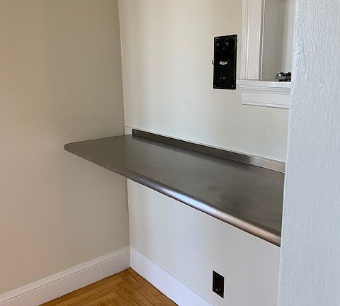 Unique vintage detailsElegant bathroomCrown moldingBeautiful hardwood floorsBuilt-in chest of drawersOriginal mosaic tilesOriginal intercom
