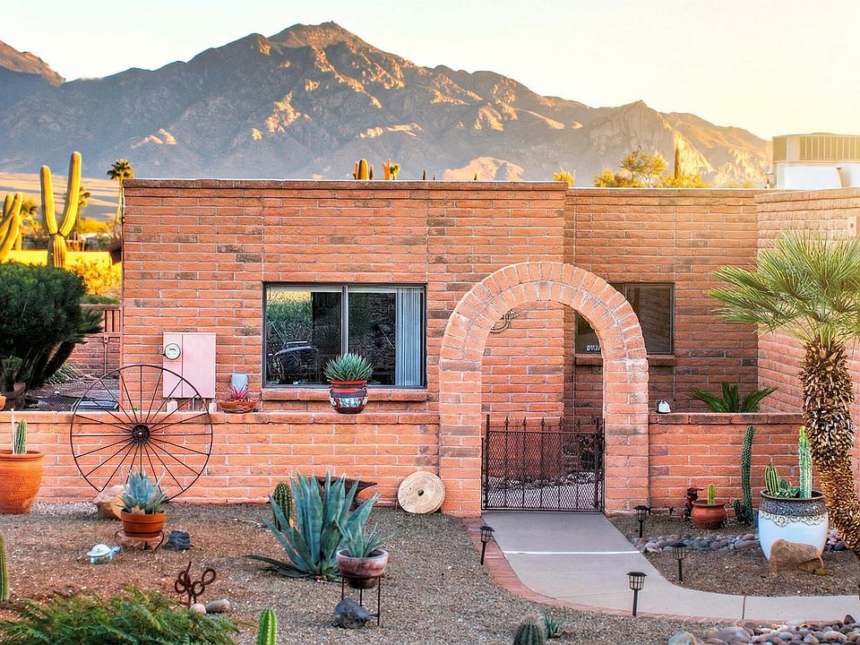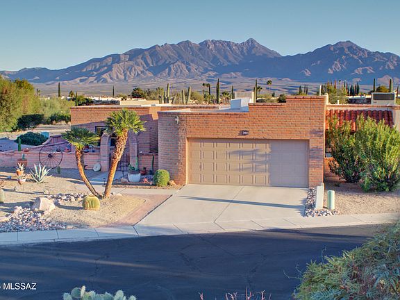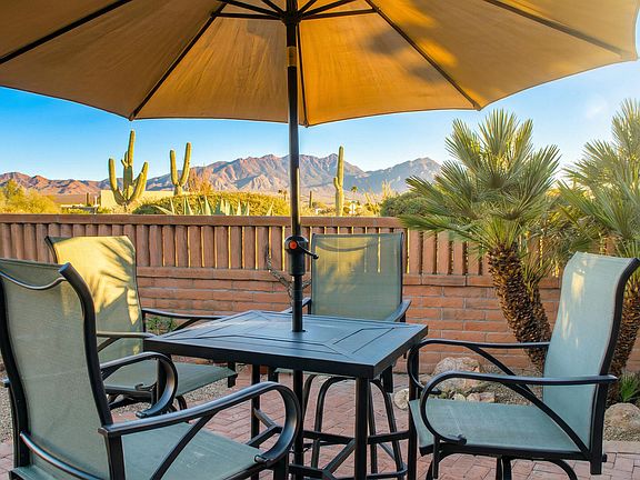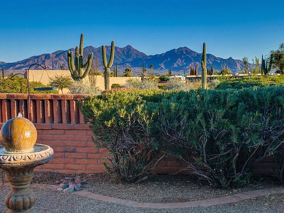 Fall in love with this charming 2-bedroom, 2-bathroom townhome with breathtaking Santa Rita mountain views.Entertain friends on your shaded patio with tranquil water feature and elegant landscaping creating your private desert oasis. Inside, enjoy stunning mountain and desert scenery from the large great room with beehive fireplace. The classic kitchen features oak cabinets, Corian countertops, formal dining and all new stainless steel appliances.Thoughtfully designed with convenient closet-to-laundry room access. Well maintained with recent updates including new roof membrane and recoat 2 years ago. Your desert retreat awaits!