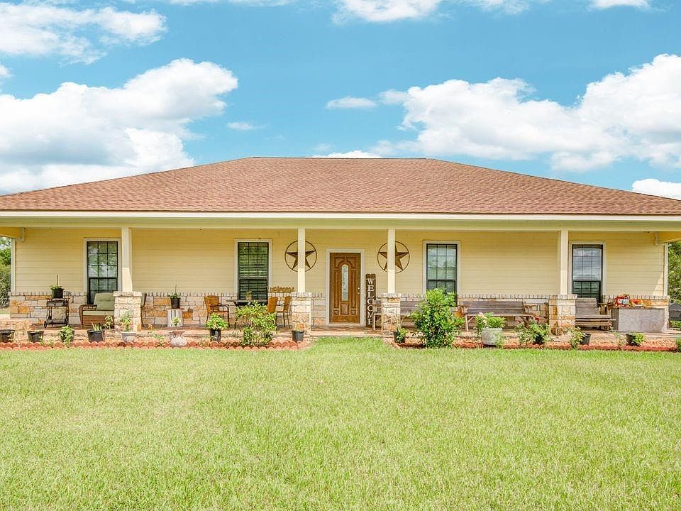 Welcome to 24910 FM 2004! This ranch style home is situated on 15 acres offering plenty of room to roam! It has an open floor plan with 4 oversized bedrooms, 3 full baths an office/extra room and indoor utility room. You will enjoy having the high ceilings and marble flooring throughout. The kitchen has custom cabinets, granite counter tops, stainless steel appliances, lots of storage and large walk in panty along with a breakfast bar. The living room has a cozy wood burning fireplace for those cool winter nights. The primary en suite has double sinks, jetted tub, separate shower and oversized walk in closet with built ins. You will enjoy having the large front patio to sit an enjoy a cup of coffee and the screened in gazebo in the back for all your gatherings. The mobile home and the pond are an extra plus! No restrictions, no flooding and conveniently located close to Chocolate Bayou. Don't miss the chance to make this one yours, call us to see it today!