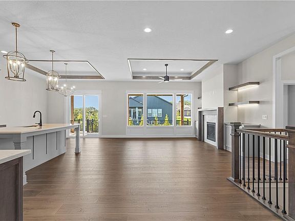 UPDATED PICTURES & FRESHLY STAGED MODEL! Now move-in ready! Introducing the new Fairfield Expanded by Inspired Homes! This fantastic Reverse 1.5 Story now boasts over 3,000 SF and is situated on a large corner lot! As one of our most popular plans, it features an open concept great room, a kitchen with ample cabinetry and counterspace (plus a HUGE walk-in pantry), and a dining area with wall-to-wall windows. The primary bedroom is spacious, having enough room for King-size furniture, and also features a spectacular bathroom and closet space, which is adjacent to your main level laundry room. The large basement has a spacious rec room, fireplace, and wet bar, while also having two additional bedrooms and a full bath for family or guests. Even though this home sits on a flat lot, the builder included an OVERSIZED covered deck with stairs leading down to the lower patio! This home includes an expanded 20’covered patio to enjoy your beautiful, flat backyard space! Inspired Homes also includes extra deep garages, 8’ garage & front doors, irrigation systems, garage openers, gas range cooking with built in SS appliances, low-e Pella windows and doors, custom wood cabinetry, tray ceilings; and the list goes on! Designer options for this home feature a lower level fireplace & wet bar, custom wood trimmed wall detail, upgraded lighting, upgraded quartz countertops, built-in cabinets & shelving in great room, direct access to laundry room from the primary closet, and a HUGE walk-in pantry! The Huntford community offers oversized 85'+ wide lots surrounded by mature trees and adjacent to Prairie Highlands golf course. Low HOA fees and less than 10 minutes from K7/I-35 highway and a short drive to Lake Olathe, Prairie Center Nature Preserves, KC Winery, and the NEW Cedar Niles Trail system!