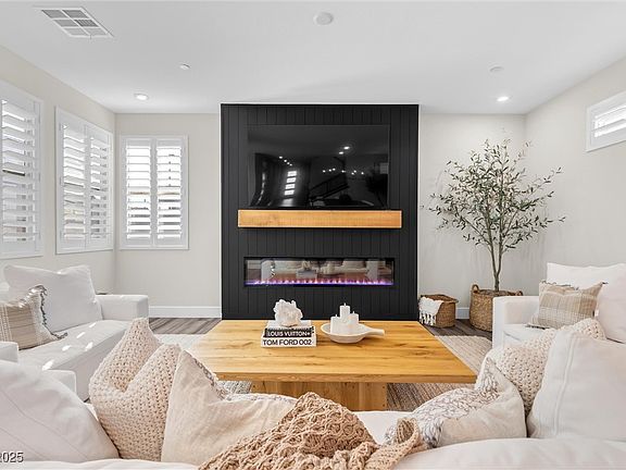LVP flooring flows throughout, complemented by plantation shutters and abundant natural light. The upgraded fireplace and TV area create a cozy gathering space, while Café appliances and a waterfall-edge countertop elevate the kitchen. The primary suite features a spa-like shower, custom closet, and connected laundry. Upstairs, a loft offers breathtaking views of Red Rock and Mount Charleston.
