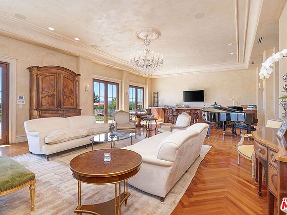 The pinnacle of luxury and grand splendor, the 10 acre view lot is located in the privacy behind the gates of a 7 home community. Timeless charm spans the over 9,000 SqFt, 7 bed, 11 bath Tuscan Estate. Inside, 12 foot ceilings and oversized glass doors illuminate the wood floors, limestone, and custom carved fireplaces in complete natural lighting. Throughout, a formal dining room, luxurious kitchen, media room, library, sun room, and beautiful subterranean wine cellar fill the house w/ an entertainers dream. Upstairs, a luxury master suite with fpl, duel bathrooms, and a stunning french door opening to a balcony view of the majestic Santa Monica mountain range. 4 additional bdrms sit upstairs, and a generous guest suite & maid's quarters located downstairs. The 360 degree royal like grounds combined w/ custom details at every turn, this home exudes elegance and panache. Completed with the superbly manicured lawn, a 75' salt water pool, and a guest house, this Estate is one of a kind!