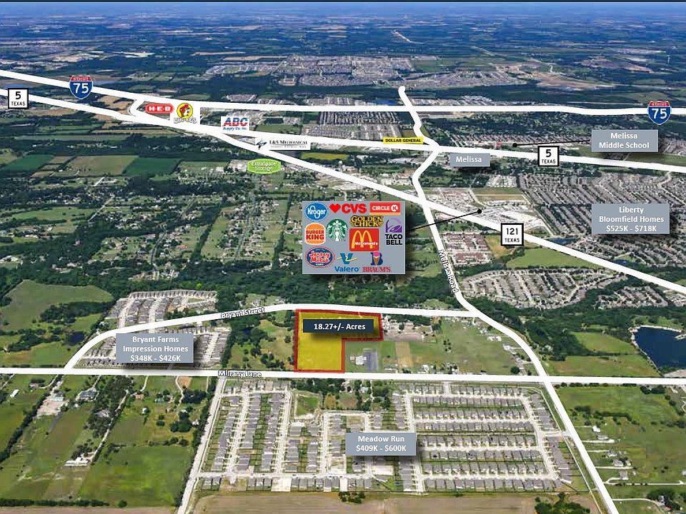 Vanguard Real Estate Advisors (“VREA”) is pleased to present qualified investors and developers the opportunity to acquire approximately 18.268+- acres located along Milrany Lane, in the rapidly growing city of Melissa, Texas. Approximately 6+- acres is zoned SF-3, which permits single-family development with minimum lot width of 60’. The remaining 12.27+- acres is zoned Agricultural.