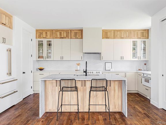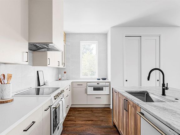 Life is lived in the details, this home captures them beautifully. Flowing like a single-family, the wide-open kitchen, living, and dining space pairs with thoughtful architectural design, embracing natural light. The kitchen shines with imported stone, sleek backsplash, walk-in pantry, and luxe white-and-gold appliances. Rich real hardwood floors set the tone, while a sleek linear fireplace and designer lighting create a warm space to linger. Striking steel-and-wood monorail open-tread stairs lead the way upstairs where three of the four bedrooms are on the same level. The primary suite features a spa bath with heated floors, three-head shower and double vanity. Enjoy sunsets on the massive third-level deck or relax in the 3rd level flexible perch room with wet bar plus bev fridge and full bath. The curated basement features 9-foot ceilings, a large rec room with a striking wet bar that's complete with wet plus beverage fridge and custom cabinetry and additional storage closets. The lower level has a private bedroom and designer bath, ideal for guests or a home gym. The outdoor space surprises in the best way as it's a spacious, landscaped front yard paired with a fenced private patio. Larger than most neighborhood backyards, it’s ideal for entertaining or simply soaking up the Colorado sun. Added perks include a tall 2-car garage EV ready (220v), EcoBee thermostat, Ring doorbell, wifi heat pumps, programmable lights and fireplace. No HOA. Party Wall Agreement. Built to Denver’s newest Green Code, this all-electric home means lower bills, cleaner in-home air plus a smaller carbon footprint. It also means higher quality windows, extra wall insulation, and more efficient heating/cooling. Denver homes built prior have not been built under the same Green Code specs. Please request the full list of upgrades. Buyer to verify taxes & square footage. Exceptional homes are rare. Don’t let this one slip away. Schedule your tour and see perfection in every detail.