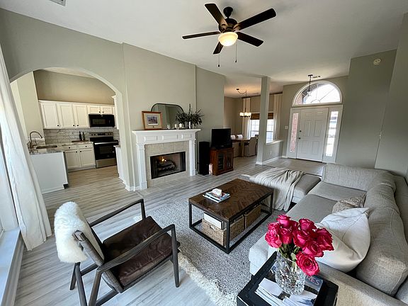 The house features 10-foot ceilings, a gas fireplace, a shed for extra storage, woven Roman shades, a large walk-in pantry, and luxury vinyl plank flooring throughout. Pool access is optional at $75 per year.