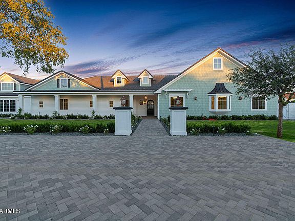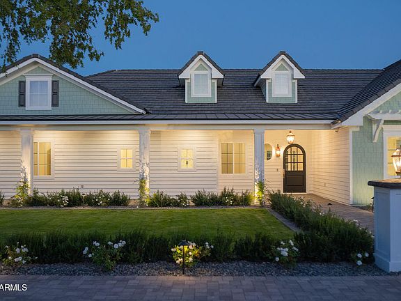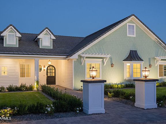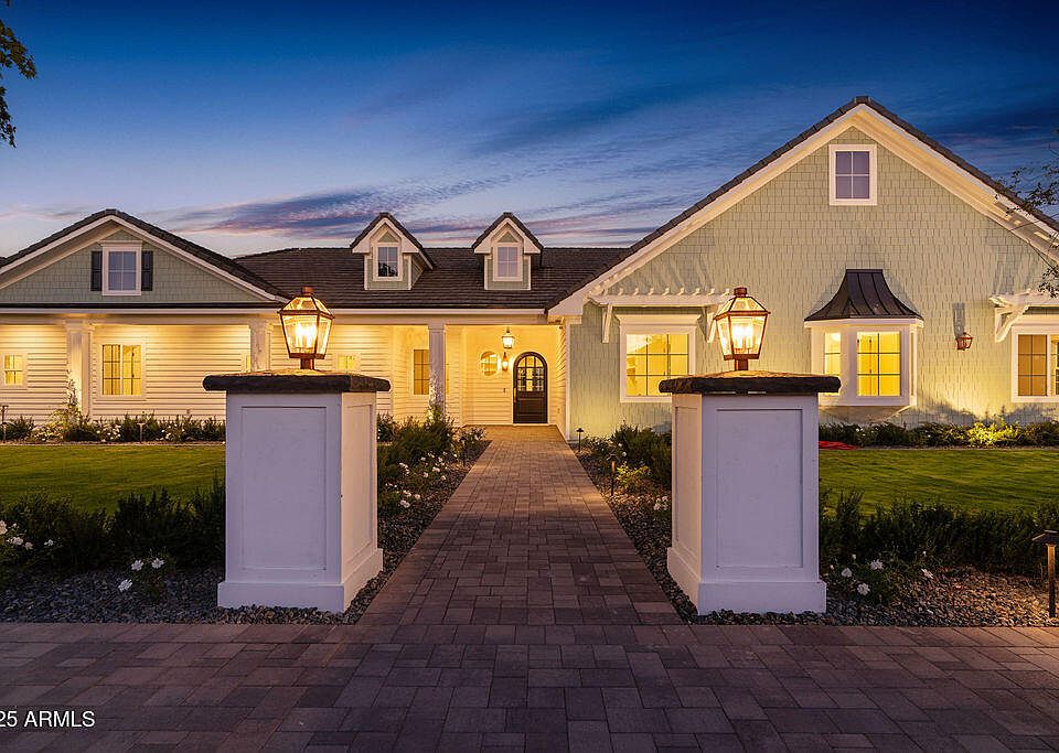 Step inside this luxurious, fully custom cottage-core new build: 4 bed, 3.5 bath, 4,172 sqft wrapped head-to-toe in James Hardie Artisan concrete board siding on a 43,223 sqft fully landscaped lot with mature citrus trees. Pre-wired Cox Wi-Fi, Netgear data ports, Wi-Fi boosters included. Built-in 8K security cameras. An arched black solid-wood door opens to a checkered gray/white tile foyer with an oval window.