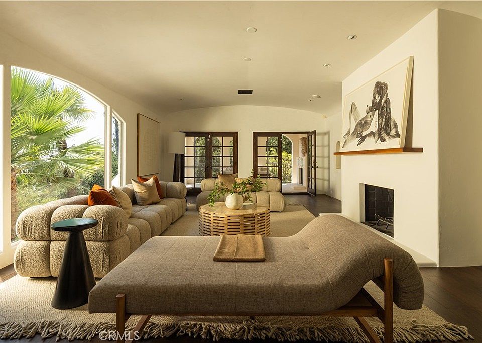 Enter through a grand foyer into an expansive living room, where floor-to-ceiling windows frame sweeping views of the Los Angeles skyline. Through double French doors, a cabana-style lounge with its own fireplace provides a cozy retreat. The interior includes a ground-level remodel in collaboration with Hub of the House Studio, featuring custom Hart & Toth cabinetry. A romantic Juliette window in the dining room overlooks your own private forest, while the chef’s kitchen features artisan concrete counters, designer appliances, and hand-troweled clay and plasterwork.