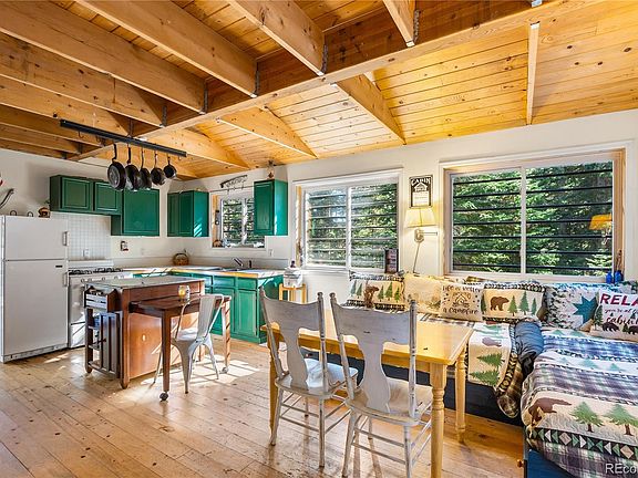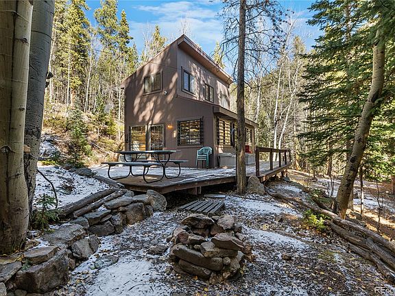 Escape to your own private mountain retreat! Nestled on 11 wooded acres in Idaho Springs, this charming 1-bed, 1-bath, 2-story cabin is the ultimate off-grid getaway amid nature & tranquility. Embracing a sustainable lifestyle, the cabin includes a composting toilet & operates without running water for a true back-to-nature experience. Tucked behind two gated entries on a private road, the property features a seasonal stream, natural spring & rock water feature beside the spacious wrap-around deck—the perfect spot for morning coffee or sunsets in mountain serenity. The land is filled with Aspen trees that blaze with vibrant color each fall, creating a truly magical atmosphere. Inside, warm tongue & groove ceilings, hardwood floors & vaulted ceilings create a cozy, open feel. The kitchen offers green cabinetry, propane appliances & a functional island with seating, flowing seamlessly into a welcoming living area centered around a wood-burning stove. A spiral staircase leads to the upper-level bedroom with built-in bookshelves, large windows & peaceful forest views. Powered by owned solar panels, this cabin includes a propane refrigerator, stove & classic clawfoot tub plumbed with a drain but not currently connected to water—previous owners used the upper spring, though the setup is no longer in use. Thoughtfully designed for guests, the cabin sleeps up to eight & comes fully furnished, ready for your next mountain adventure. Enjoy abundant wildlife—elk, deer & bears—and nearby trails for hiking & ATV exploration. With a solid cinder block foundation, strong bones & easy access to town despite its secluded setting, this home blends rustic comfort with self-sufficient living. Located 2.5 miles up Ute Creek Road, a high-clearance 4WD vehicle is recommended for access. Whether you’re seeking solitude, a weekend escape or a nature lover’s haven, this cabin invites you to relax, unplug & reconnect with the great outdoors. Day in the Life Video: https://youtu.be/KzIAfDeSDWA
