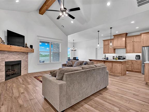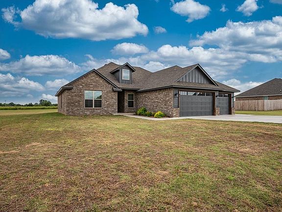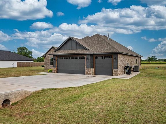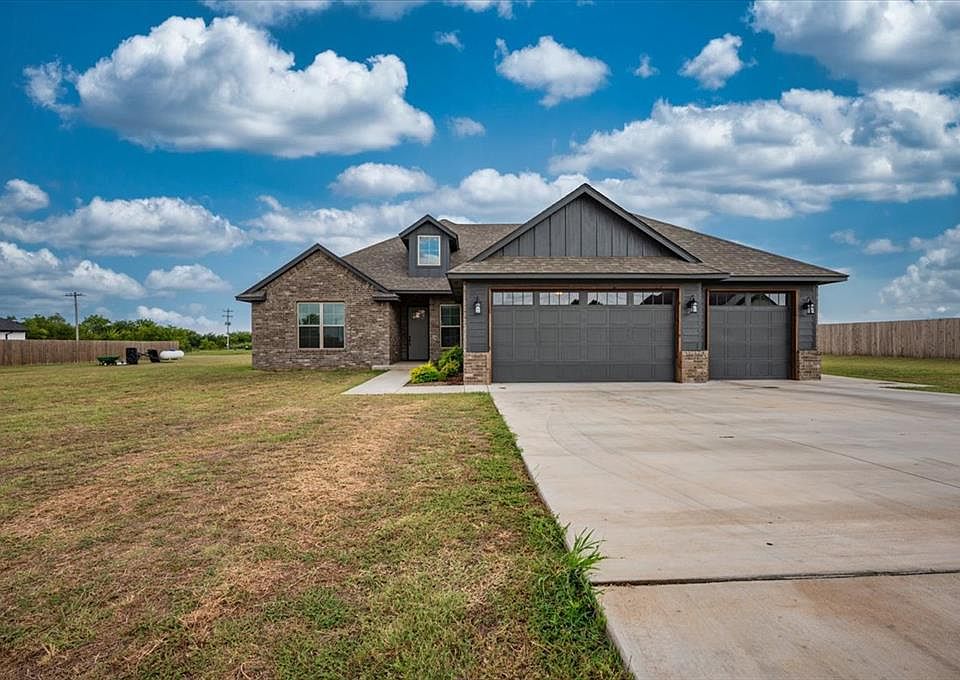 This beautiful 5-bedroom, 3-bath home in Vista Bonita Addition, Purcell, OK, sits on a spacious 1.048-acre lot and combines modern luxury with functional design. Featuring an open-concept living area with vaulted ceilings, a cozy corner fireplace, and a chef-inspired kitchen with a gas cooktop, large pantry, and island seating, this home is perfect for entertaining. The primary suite offers a spa-like en suite with double vanity, walk-in shower, and a massive walk-in closet with built-ins. Additional highlights include a 3-car garage with a storm shelter, a utility room with ample storage, and a covered patio for outdoor enjoyment. Schedule your showing today!