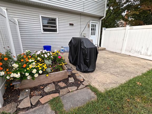 Remodeled 2BR/1BA duplex with updated kitchen, bath, flooring, lighting, doors, and patio. Eat-in kitchen includes granite countertops, tile flooring, and appliances (refrigerator, dishwasher, oven, microwave). Living room has laminate flooring; large main bedroom and second bedroom with updated bath. Unfinished basement with laundry hookups. Exterior features front porch, back patio, large yard with underground electric fence, 1-car garage, and driveway parking. Dogs permitted with pet fees, no cats. Landlord occupies adjoining unit.