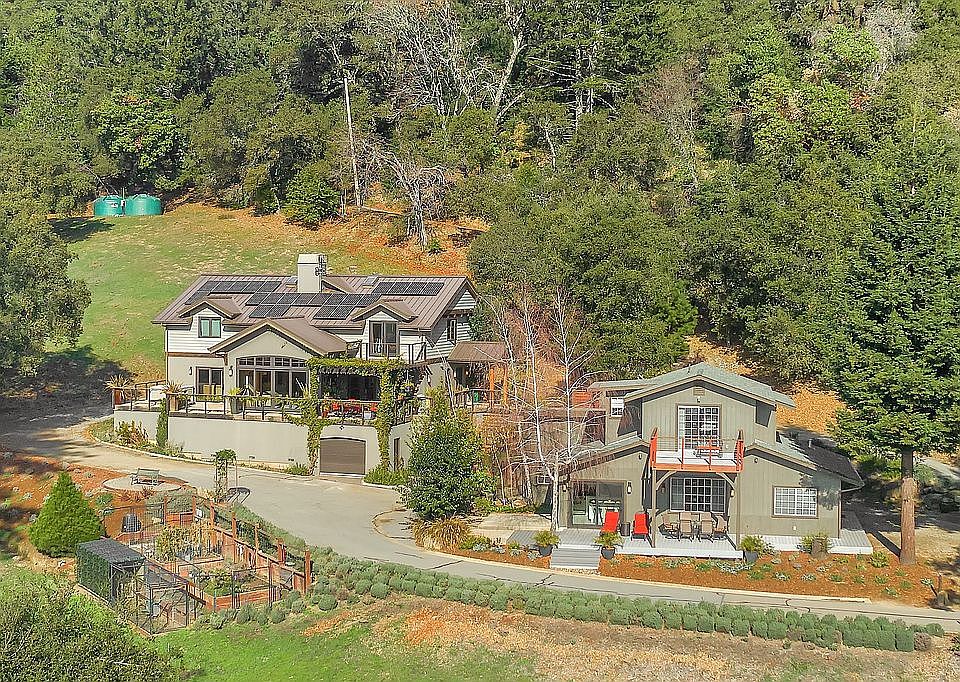 Rare 4 acre property has two homes with views of redwoods and sparkling Monterey Bay. The Guest home provides great opportunity for additional family living, rental income or office spaces. The 3,466 sq ft, 3 bedroom, 4 bath Main house built new in 2013, 4th bedroom is currently used as an office, with fire ignition resistant construction, provides luxury design, open beam ceilings to 24 ft, fireplace, hardwood floors throughout and solar. A 1,368 sq ft deck with spa and views is accessible via the chefs kitchen, living and family room. The 1,789 sq ft Guest home has 3 bedrooms, 2 baths, plus bonus room. Each house has its own attached garage/workshop. Acres of usable land, expansive parking, room for horses with 29,000 sq. ft. of unfinished pipe corrals, several suitable building sites for additional barns or garages. A perfect location just, 13 miles to Capitola beach, 12 miles to Los Gatos and 7 miles to Soquel Demonstration Forest hiking and biking, Los Gatos Schools.