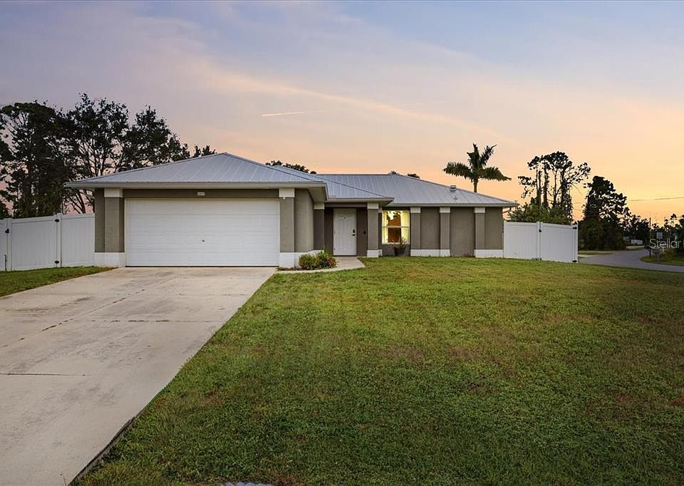 Beautiful and airy 3-bedroom, 2-bath home situated on an oversized, fully fenced corner lot with dual gated entrances one 10 ft and one 5 ft wide perfect for boat or RV parking. This open split floor plan offers vaulted ceilings, abundant natural light, and fresh neutral finishes throughout. METAL ROOF installed in 2022 The kitchen features a breakfast bar and opens to the dining and living areas, creating a seamless flow ideal for entertaining. The private master suite includes two spacious walk-in closets and an updated master bathroom with dual sinks and a walk-in shower. New flooring enhances the home’s clean, modern feel. Enjoy the screened-in lanai overlooking the large backyard, offering plenty of room to relax or play. Conveniently located near Price Blvd, Toledo Blade, and just minutes from I-75, this property provides an easy commute and quick access to shopping, dining, and all that North Port has to give. A must-see combination of comfort, updates, and location.