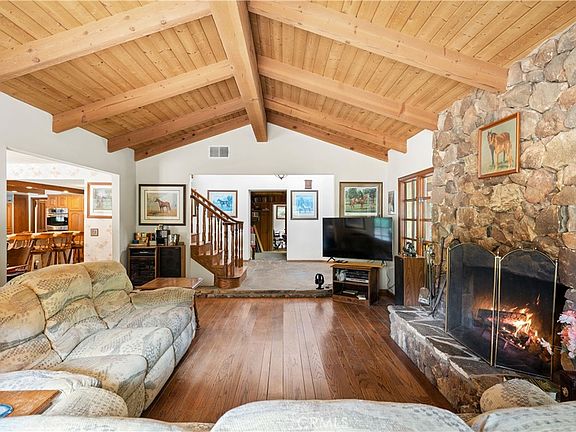 Welcome to the historic 24970 Bob Batchelor. With its origins as a one room hunting lodge in 1916, it was expanded into a home in the mid-1980’s with beamed tongue and groove, cathedral ceilings and an open concept. The expansive kitchen with large central island has built in stainless appliances and is the central room between three lower level bathrooms with two baths, the dining area, the spacious and inviting great room, and the game-room/den, and the large outdoor patio open to the front of the home. Grand fireplaces built from rock direct from the property stand proudly in the living room and den. Another fireplace anchors the large upstairs primary suite with walk-in closet, jacuzzi tub and views of the massive property. Just beneath the Saddle Peak ridge with views of the entire valley on near six and a half acres, the land includes stables, multiple pastures, secret waterfall and seasonal stream and pond gives you the feeling that you are in the middle of a Western movie. Seemingly far away from civilization, Bob Batchelor is only minutes from Calabasas High and Calabasas Commons, and a very short drive to Malibu Beach and Pacific Coast Highway.