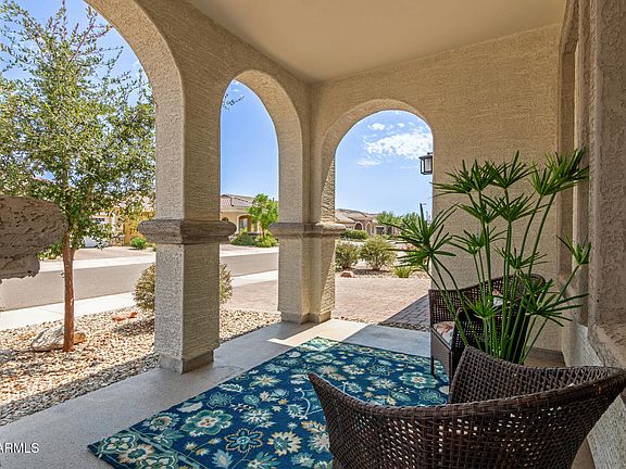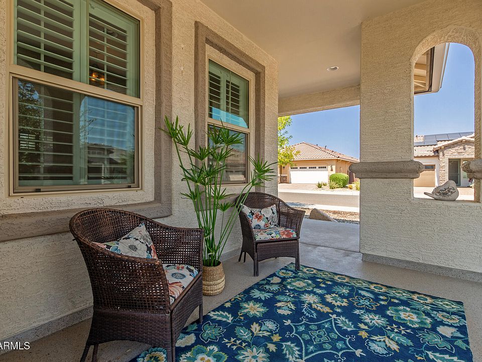 Better than New! This beautifully upgraded home is the perfect Arizona retreat, set on a premium corner lot in the desirable Heritage at Asante community with resort-style amenities—you'll feel like you're on vacation every day. Start your mornings with coffee on the charming front porch and end your evenings entertaining on the extended back patio. Inside, the open-concept floor plan offers a seamless flow, with split bedrooms providing comfort and privacy for all. Thoughtful upgrades are found throughout: plantation shutters on every window, custom shades, garage cabinets with epoxy-coated flooring, a stylish security door, rain gutters, and pull-out kitchen shelving. The builder's best flooring package—no carpet— enhances the home's clean, modern look. The backyard is designed for low-maintenance enjoyment with an extended paver patio, lush turf, and plenty of space to relax and soak in the Arizona weather.