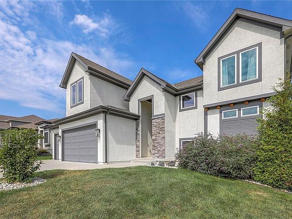 This 1.5 story home offers 4 bedrooms, 3.5 bathrooms, and nearly 3,000 square feet of space with recent updates including new interior paint and lighting. Built just five years ago, the main level features soaring ceilings, natural light, and hardwood floors throughout the living, kitchen, dining, mud room, and powder room areas. The open-concept great room includes a wood-plank inset ceiling, stacked-stone fireplace, and floating shelves, flowing into a gourmet kitchen with white cabinetry, quartz counters, marble backsplash, stainless steel appliances, a large island, and a hidden walk-in pantry with a coffee bar and appliance storage. The dining area opens to a covered deck with a ceiling fan and a fenced backyard with an additional patio.