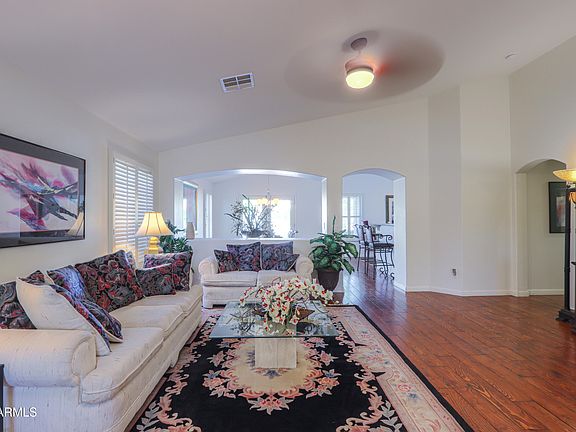 This beautiful turn-key home is ready for it's new owners. 3+ Bedrooms with large walk in closets. 2 full bathrooms with a soaker tub in the primary. Vaulted ceilings in the living room and kitchen. A lovely office/den in the front room. Real wood floors in all the main areas. Updated cabinets throughout. The garage has epoxy flooring. Newer water softener. Low maintenance landscaping. Laundry room is spacious and has cabinets for plenty of storage. Out back, enjoy the tranquility of mountain views and the large wash that provides privacy. This lovely community boasts an abundance of activities including Golf, pickle ball, a grill, activity center and pool to name a few! A mere 15-20 minute walk from this home. Furniture included!