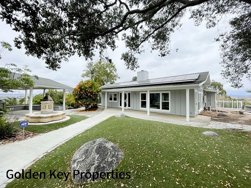 Charming farmhouse available in rural Vista on 3 acres with solar! Single level, 3 bedroom / 2 bathroom, 2130 square feet with a country setting and amazing views in every direction. Secured gated access, spacious living area with a Franklin stove, updated kitchen with granite counters, recessed lighting, private patio area, 2-car detached garage with additional office/storage space, large covered patio with built-in sink, mini-fridge, and BBQ area. This property was once an active nursery and now features plenty of usable land. One of the greenhouses is currently occupied by a succulent business, and there is an occupied detached cottage on the property.