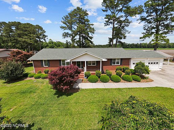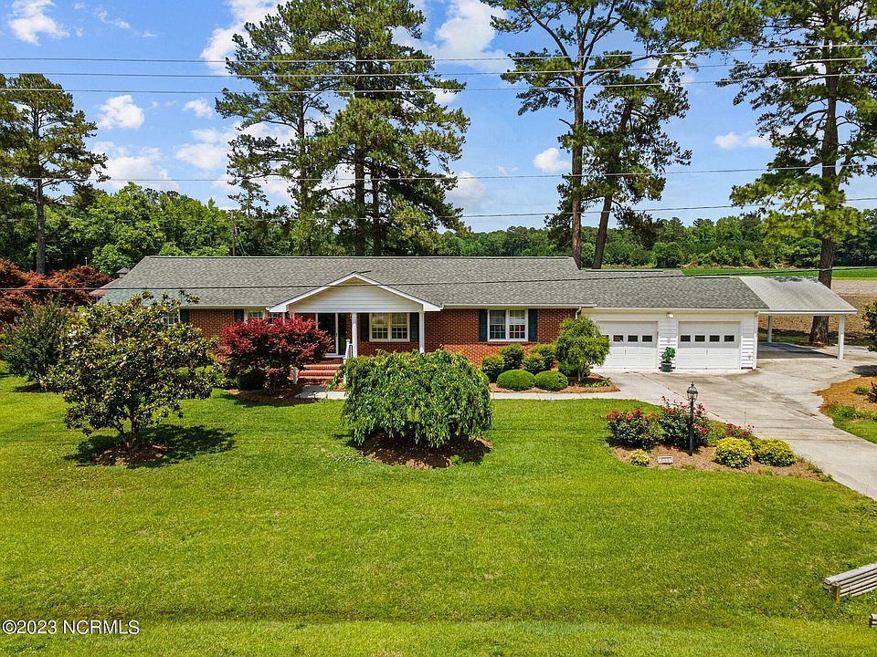 This brick ranch is in Lenoir county and conveniently located close to town. Includes 3 bedrooms with plenty of closets and storage and 2 full bathrooms. Master bedroom is handicap accessible. Beautiful hardwood floors throughout most of the home. Open floor plan with roomy kitchen, dinning and living areas, all with ceiling fans. Home has 2 car garage with circlular driveway and covered shelter to drive under. Nice areas outside include a beautiful covered front porch and ample patios in the back overlooking open fields. The yards also have an inground sprinkler system and a storage building in back yard . The roof has been updated within last few years. The HVAC is new. Replacement windows are also throughout the home.