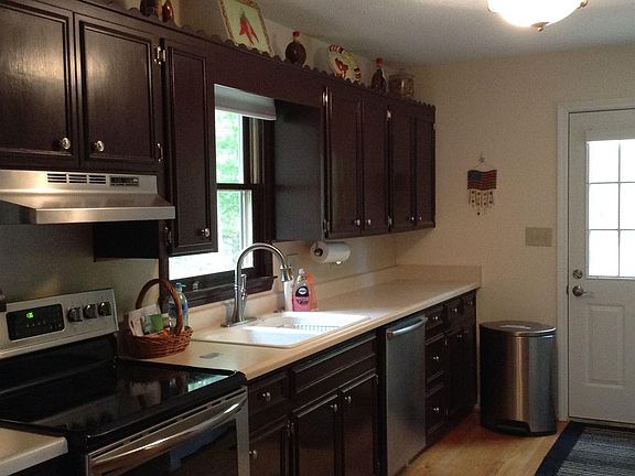 - Kitchen: Counter Tops-Solid Surfac, Floors-Hardwood, Cabinets-Stained