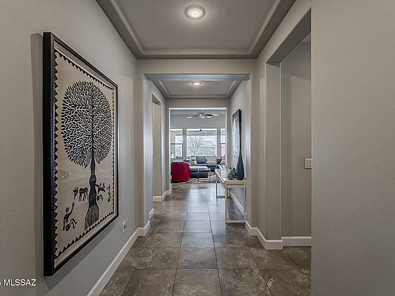 Where resort days become everyday.Built in 2020 in coveted Quail Creek, this home lives like a private club with the mountains for company. Mornings start on the charming front patio; afternoons drift to the sparkling, gas-heated pool wrapped in travertine decking and year-round green astro turf. The outdoor living room--with patio TV, electric roll-down screens, gas stub for BBQ, and a view wrought-iron fence--looks over a natural desert arroyo for true backyard privacy.Inside, the tone is quietly upscale: tile flooring in the living areas, plush carpet in bedrooms, crown molding, high baseboards, custom ceiling fans, and statement lighting (dining chandelier + pendant bar). The gourmet kitchen brings a convection oven, butler's pantry, and beverage station/wet bar; a nearby flex room works beautifully as an office/den. The bay-window primary suite feels retreat-like, with a soaker tub, dual vanities, and a tiled, separate shower. Guests get their own ensuite; a powder room, and large utility closet; the laundry room adds upper cabinets, a big folding counter, and a hanging rod (washer/dryer negotiable). Up front, a custom wrought-iron security door sets the welcome.